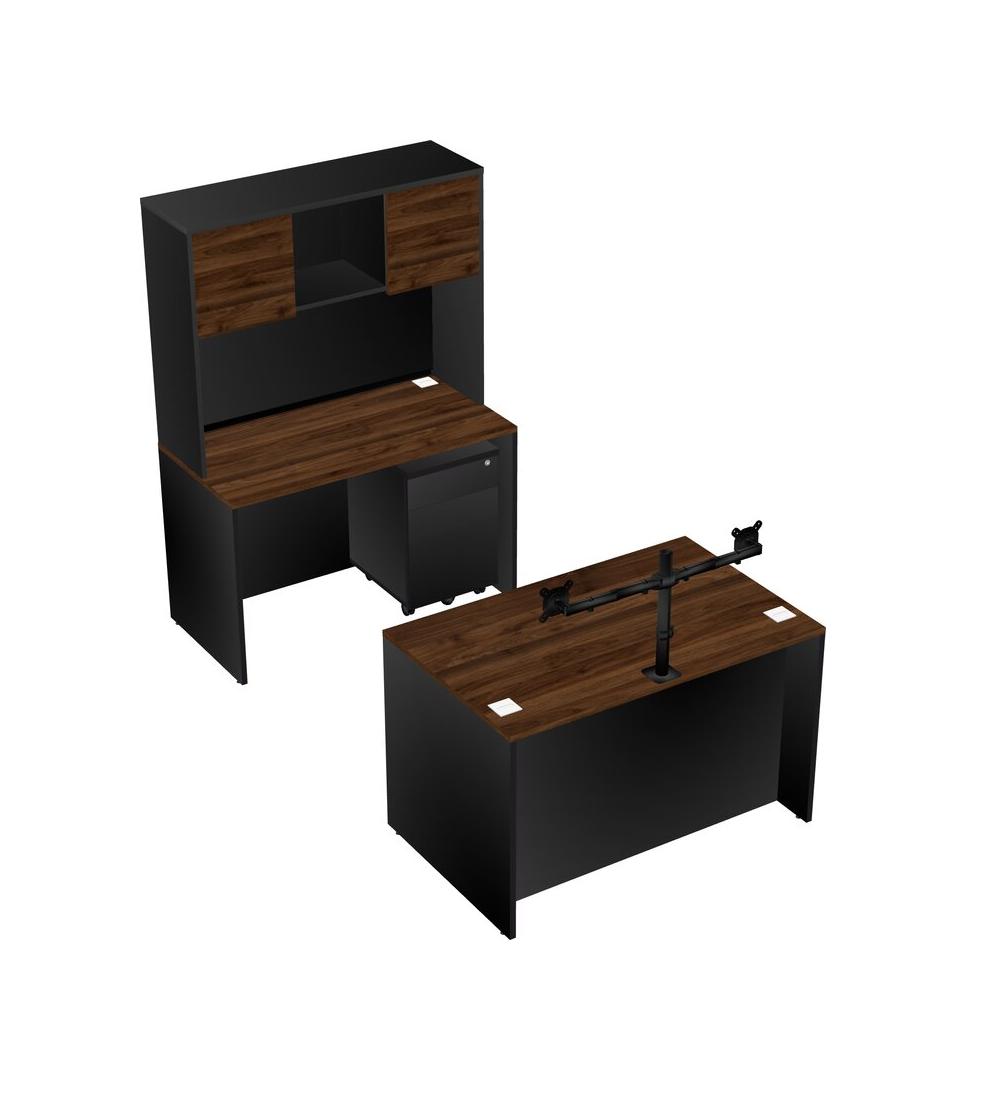 Office Parallel Desk Credenza Desk + Wooden Mobile Drawers + Hutch + Monitor Arm (double Arms)