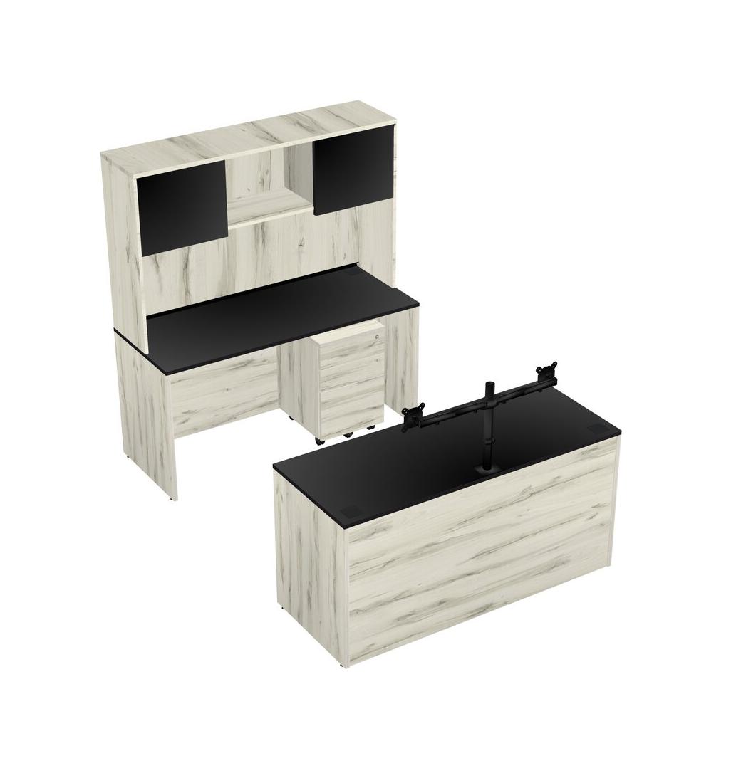 Office Parallel Desk Credenza Desk + Wooden Mobile Drawers + Hutch + Monitor Arm (double Arms)