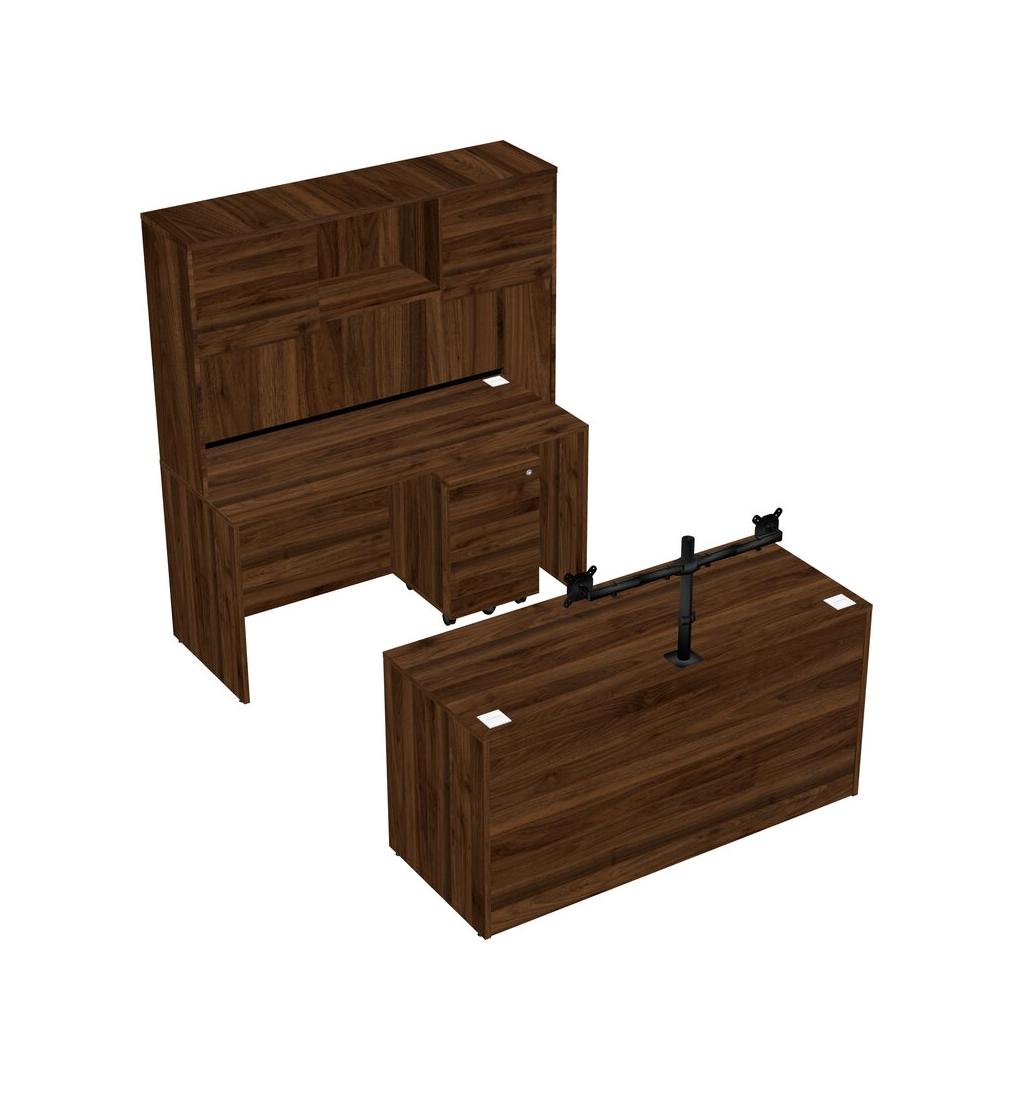 Office Parallel Desk Credenza Desk + Wooden Mobile Drawers + Hutch + Monitor Arm (double Arms)