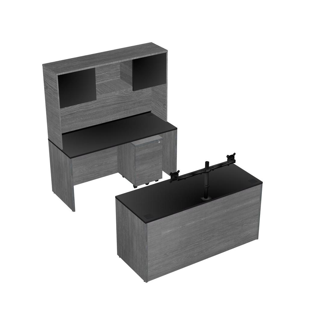 Office Parallel Desk Credenza Desk + Wooden Mobile Drawers + Hutch + Monitor Arm (double Arms)