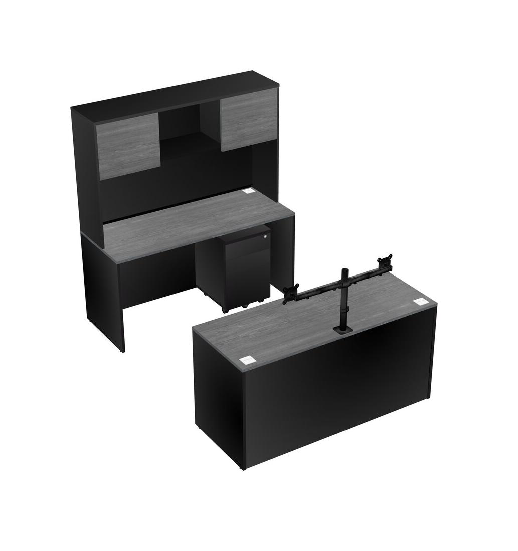 Office Parallel Desk Credenza Desk + Wooden Mobile Drawers + Hutch + Monitor Arm (double Arms)
