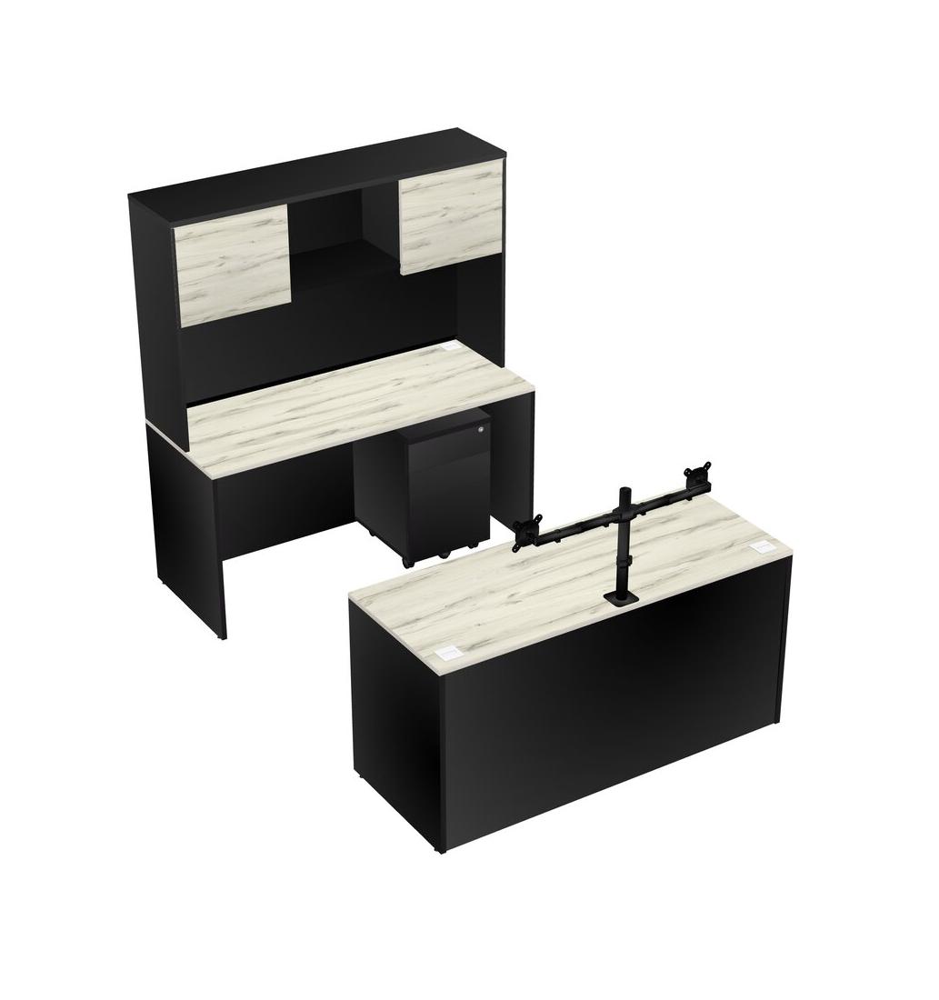 Office Parallel Desk Credenza Desk + Wooden Mobile Drawers + Hutch + Monitor Arm (double Arms)
