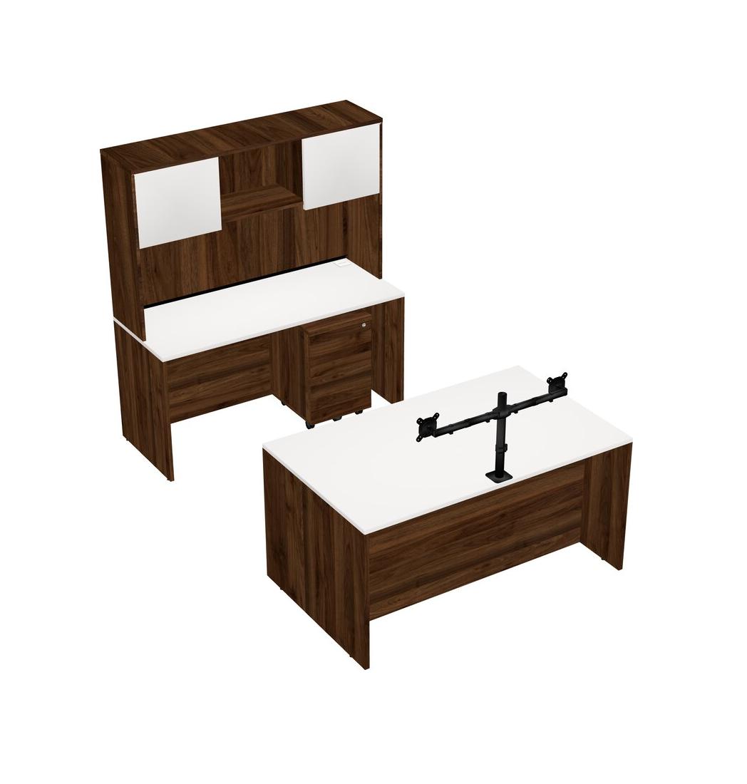 Office Parallel Desk Credenza Desk + Wooden Mobile Drawers + Hutch + Monitor Arm (double Arms)