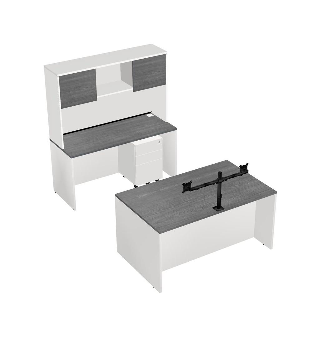 Office Parallel Desk Credenza Desk + Wooden Mobile Drawers + Hutch + Monitor Arm (double Arms)