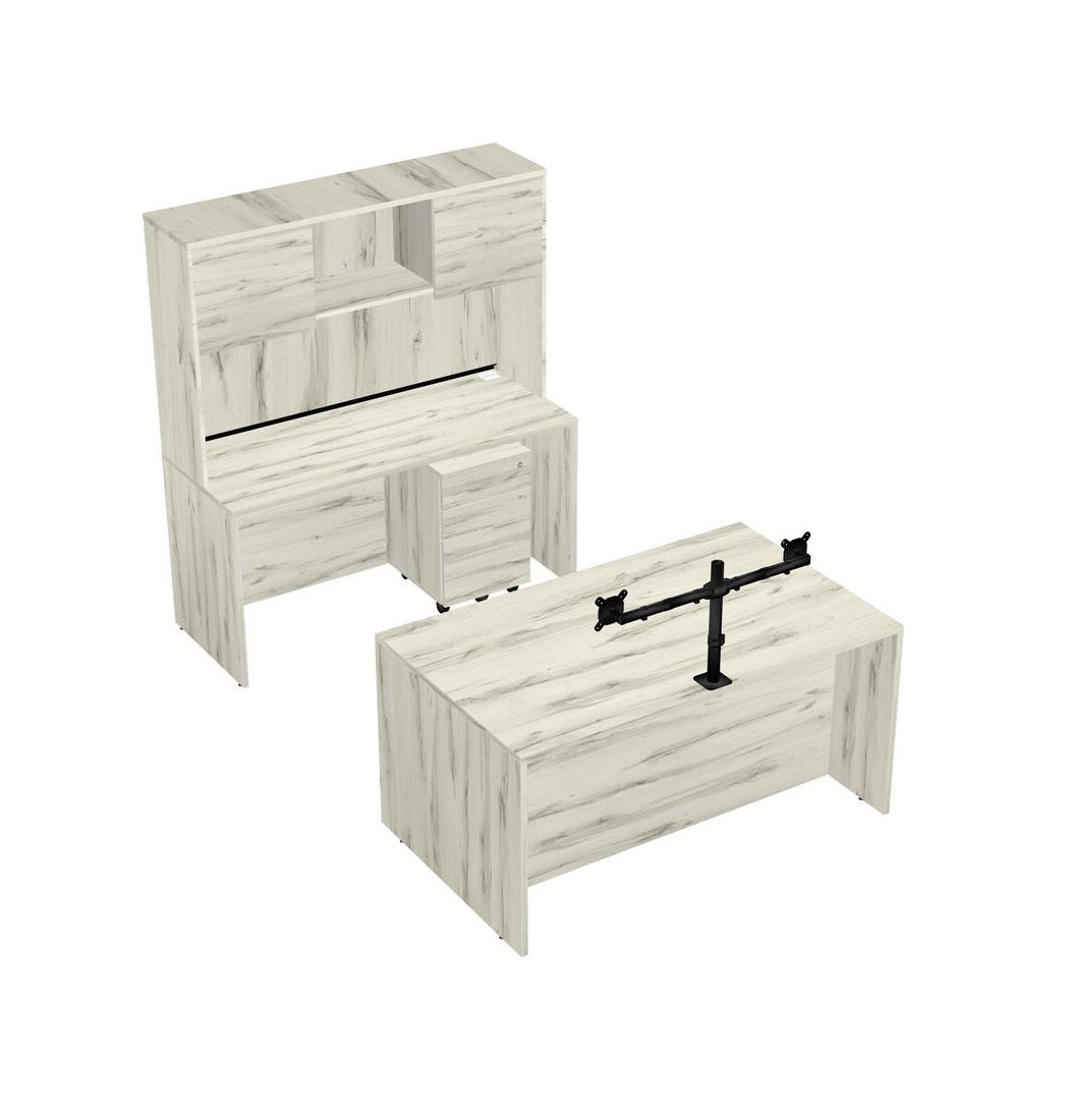 Office Parallel Desk Credenza Desk + Wooden Mobile Drawers + Hutch + Monitor Arm (double Arms)
