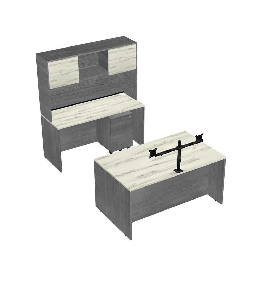 Office Parallel Desk Credenza Desk + Wooden Mobile Drawers + Hutch + Monitor Arm (double Arms)