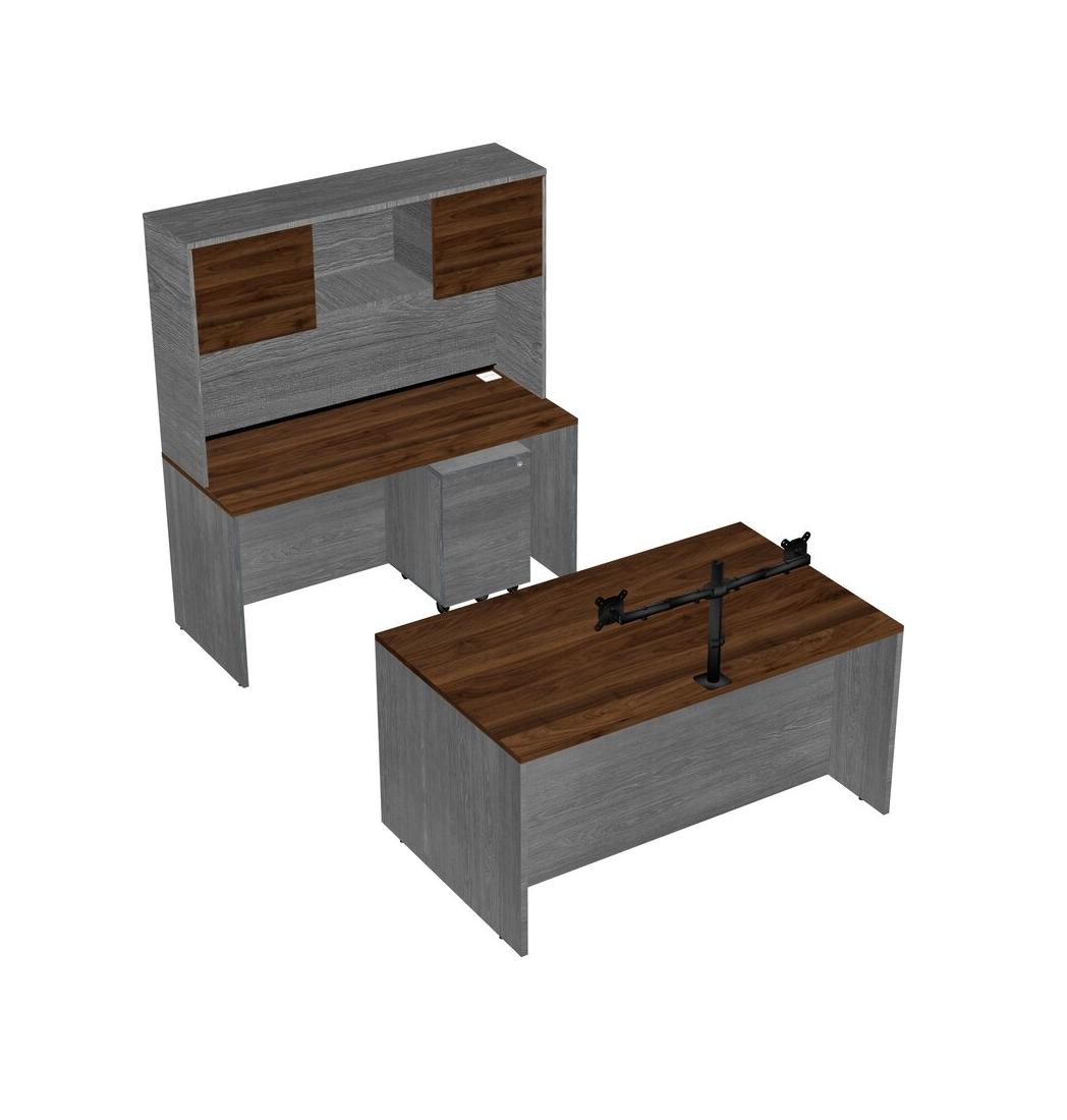 Office Parallel Desk Credenza Desk + Wooden Mobile Drawers + Hutch + Monitor Arm (double Arms)