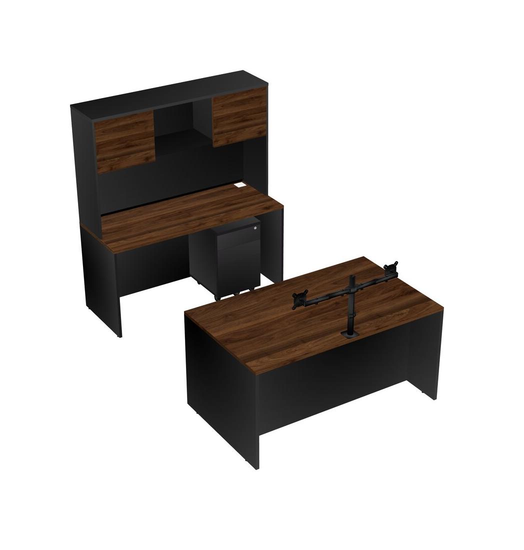 Office Parallel Desk Credenza Desk + Wooden Mobile Drawers + Hutch + Monitor Arm (double Arms)