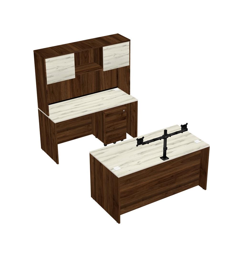 Office Parallel Desk Credenza Desk + Wooden Mobile Drawers + Hutch + Monitor Arm (double Arms)