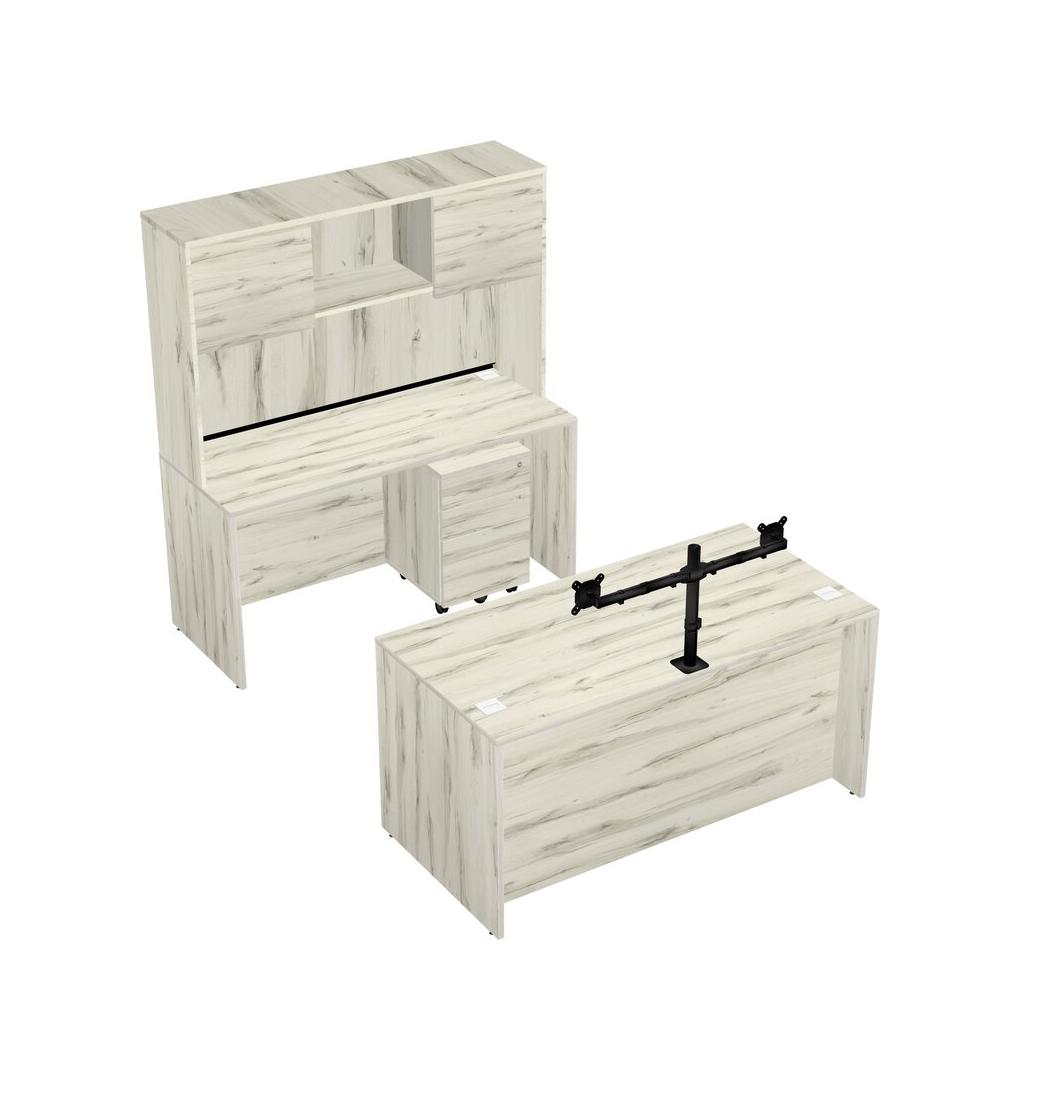 Office Parallel Desk Credenza Desk + Wooden Mobile Drawers + Hutch + Monitor Arm (double Arms)