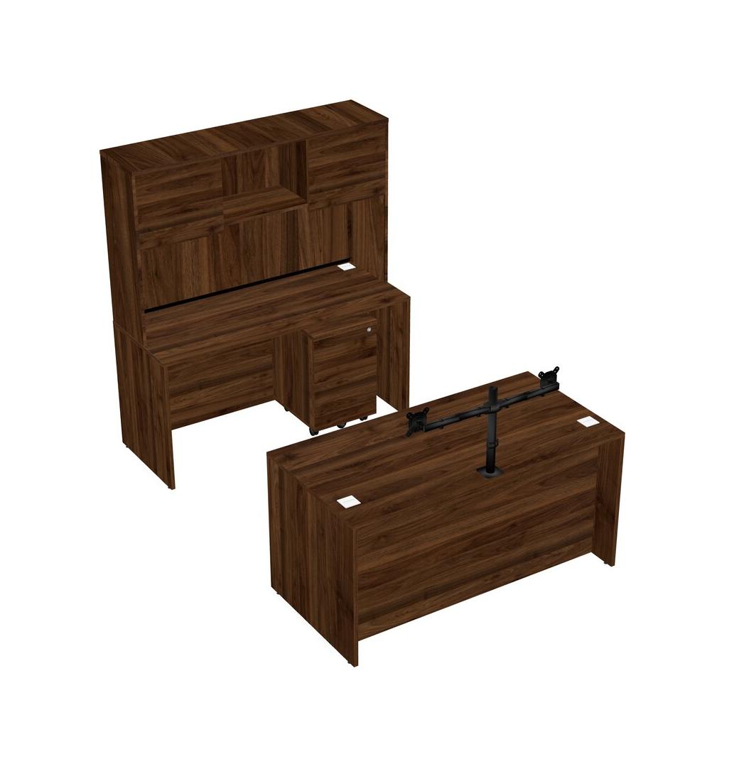Office Parallel Desk Credenza Desk + Wooden Mobile Drawers + Hutch + Monitor Arm (double Arms)