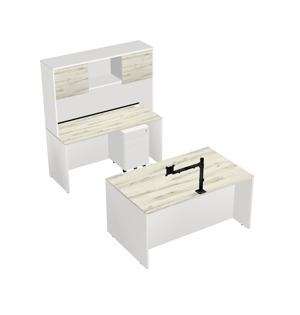 Office Parallel Desk Credenza Desk + Wooden Mobile Drawers + Hutch + Monitor Arm (single Arm)