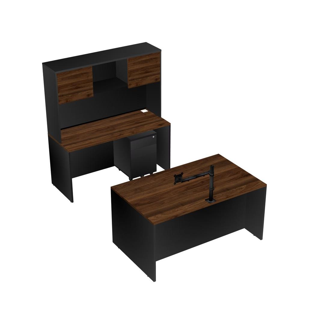 Office Parallel Desk Credenza Desk + Wooden Mobile Drawers + Hutch + Monitor Arm (single Arm)