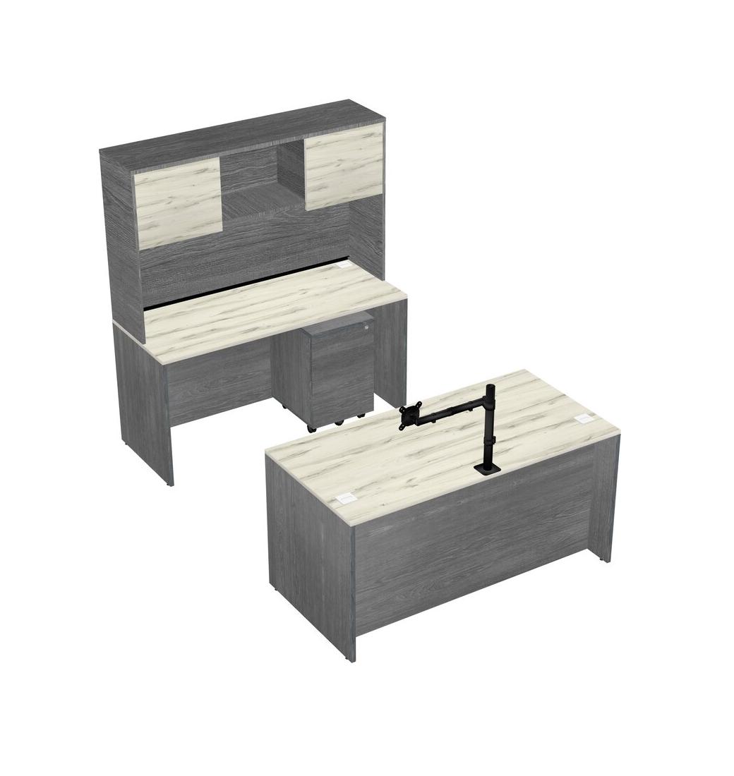 Office Parallel Desk Credenza Desk + Wooden Mobile Drawers + Hutch + Monitor Arm (single Arm)