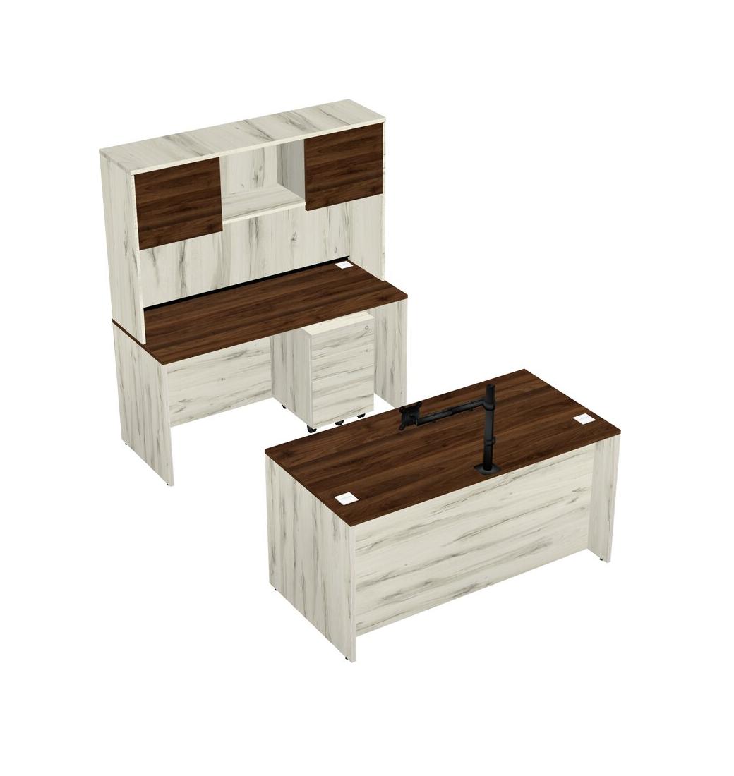 Office Parallel Desk Credenza Desk + Wooden Mobile Drawers + Hutch + Monitor Arm (single Arm)