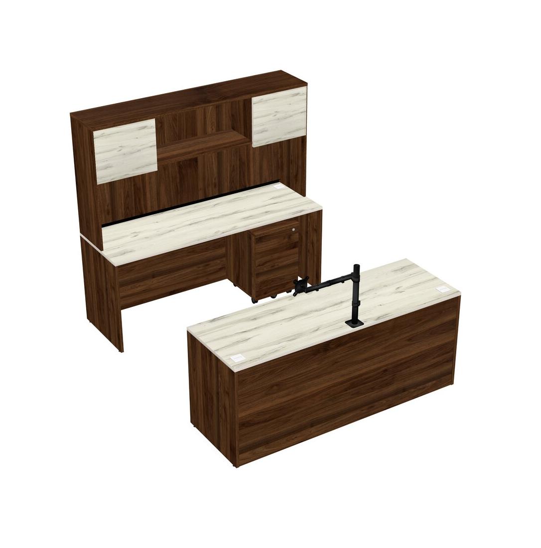 Office Parallel Desk Credenza Desk + Wooden Mobile Drawers + Hutch + Monitor Arm (single Arm)