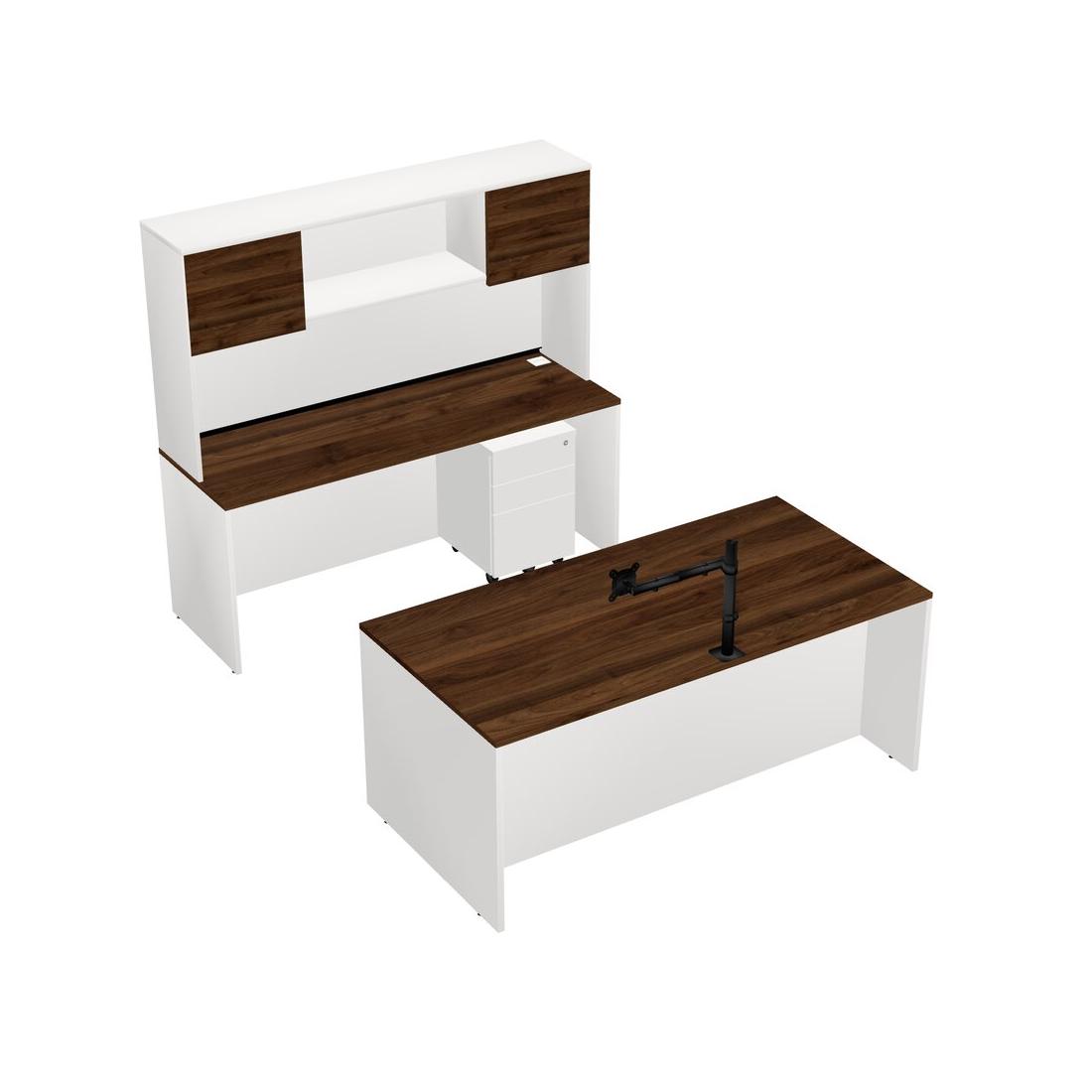 Office Parallel Desk Credenza Desk + Wooden Mobile Drawers + Hutch + Monitor Arm (single Arm)
