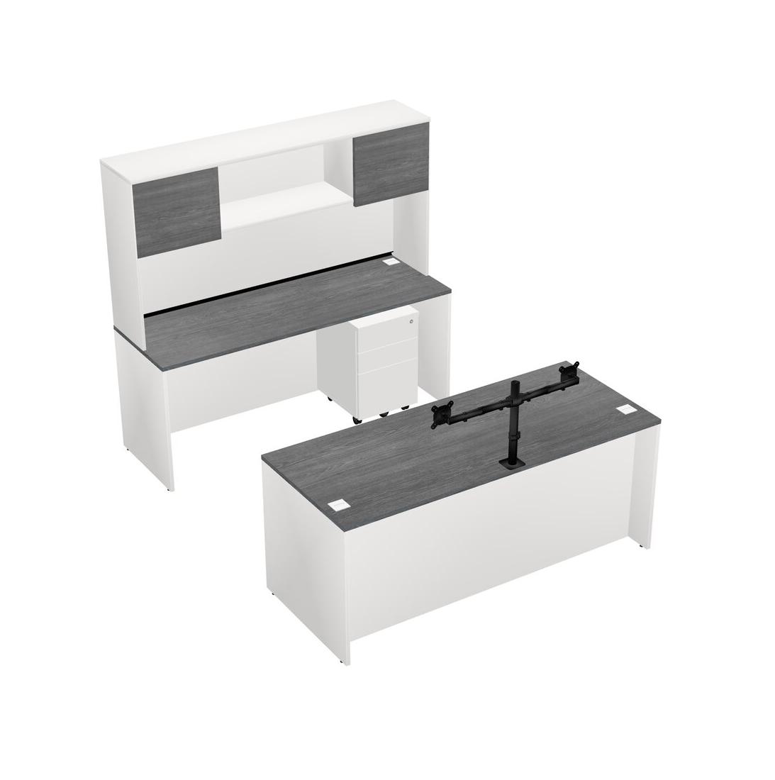 Office Parallel Desk Credenza Desk + Wooden Mobile Drawers + Hutch + Monitor Arm (double Arms)