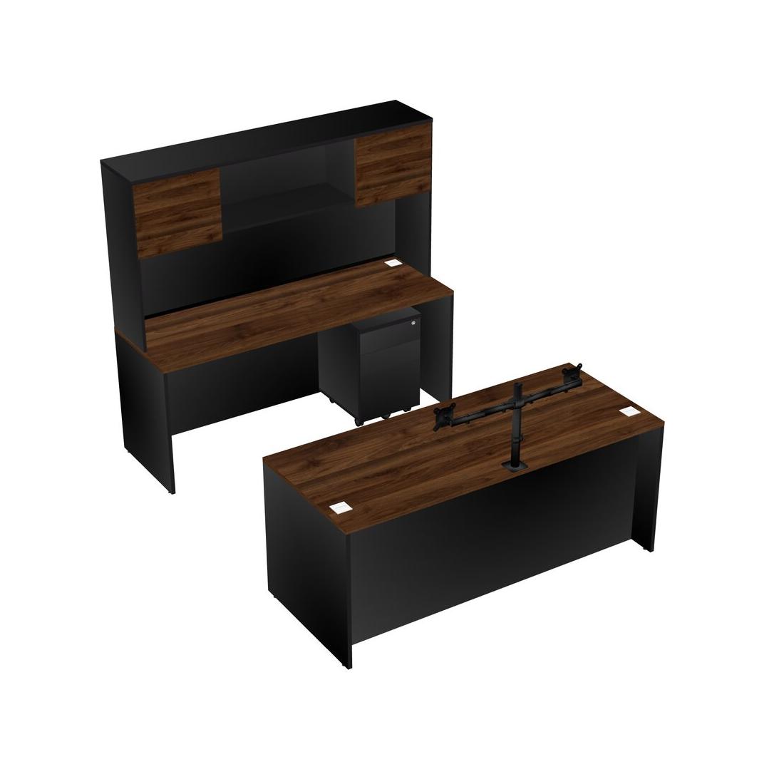 Office Parallel Desk Credenza Desk + Wooden Mobile Drawers + Hutch + Monitor Arm (double Arms)