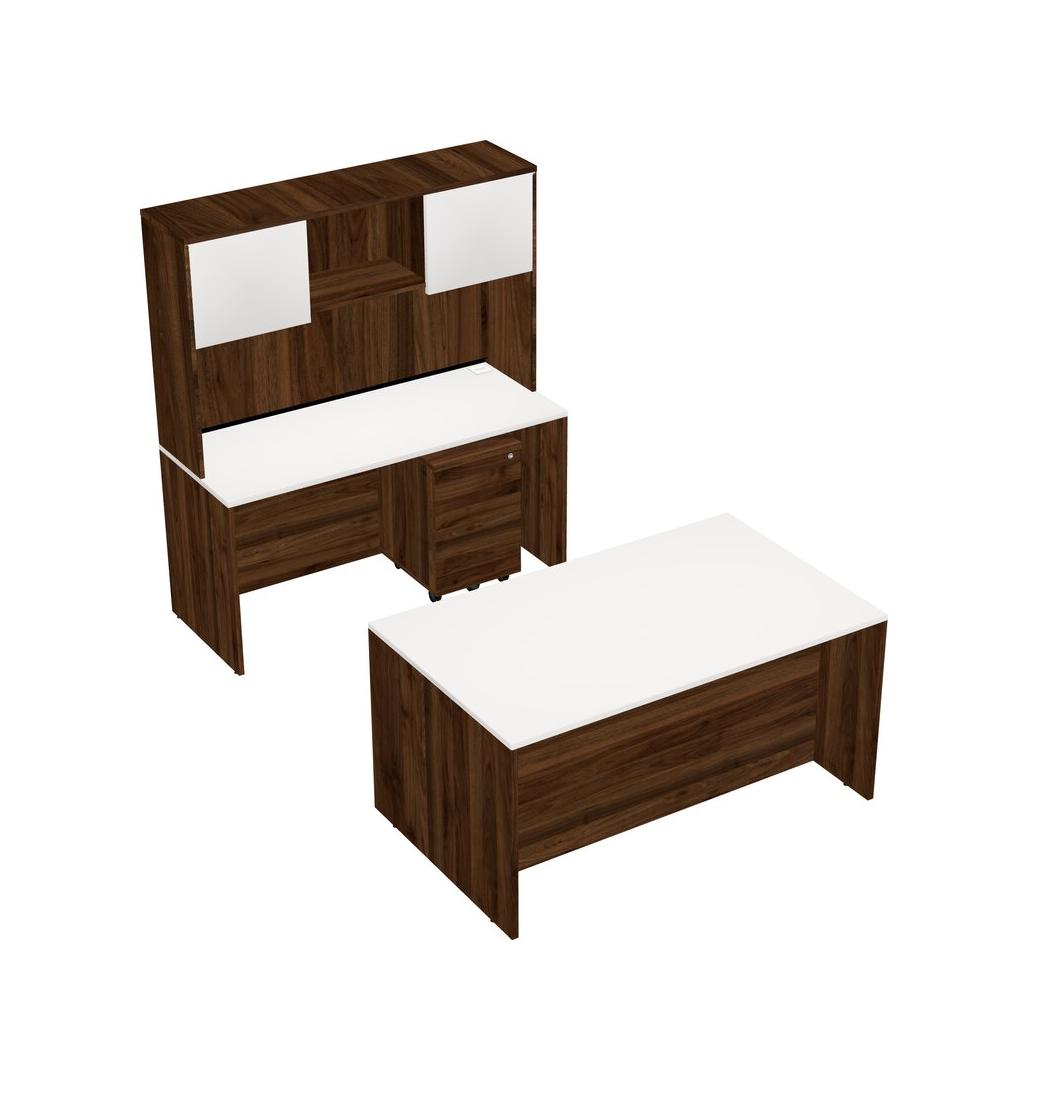 Office Parallel Desk Credenza Desk + Wooden Mobile Drawers + Hutch