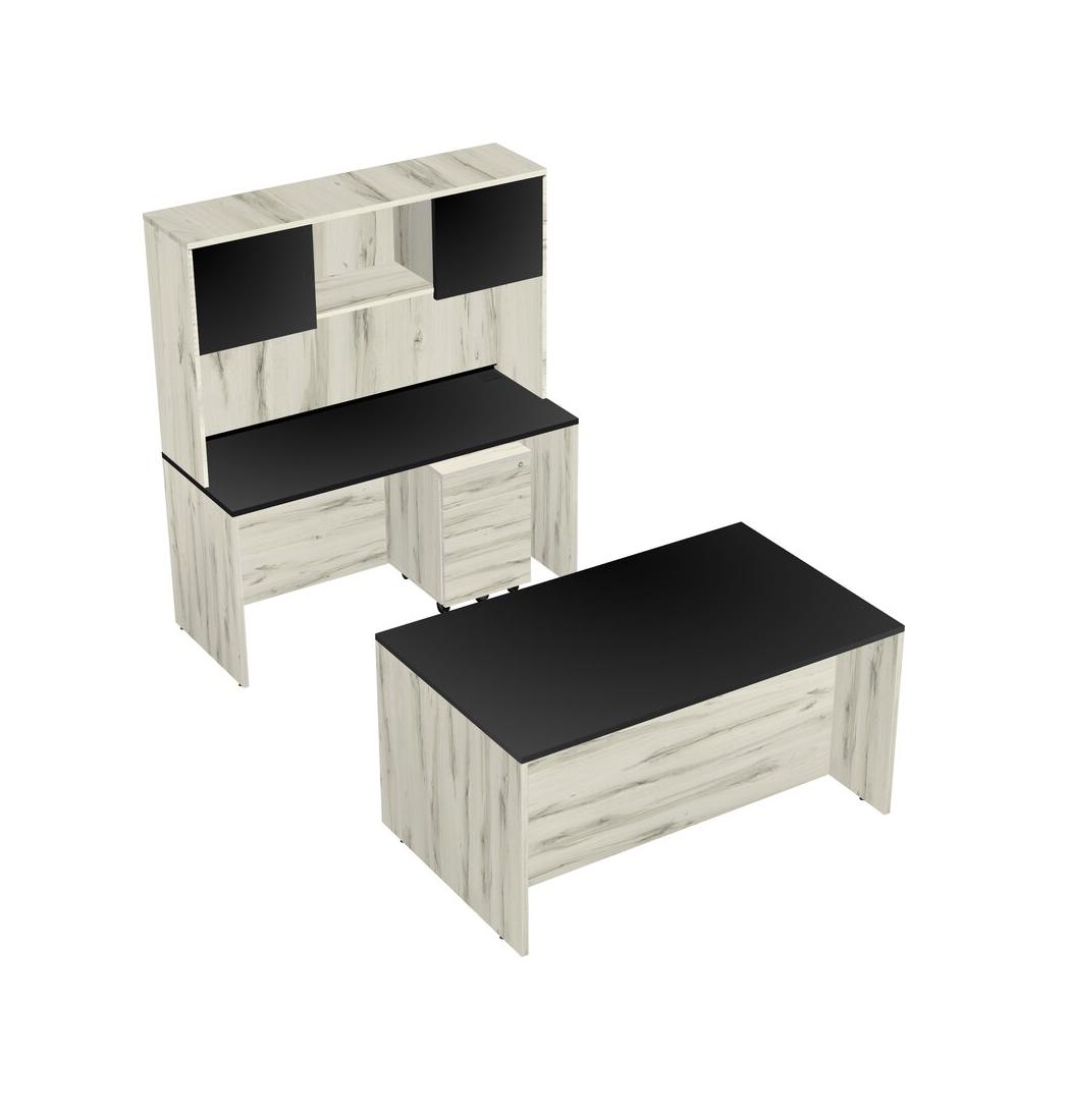 Office Parallel Desk Credenza Desk + Wooden Mobile Drawers + Hutch