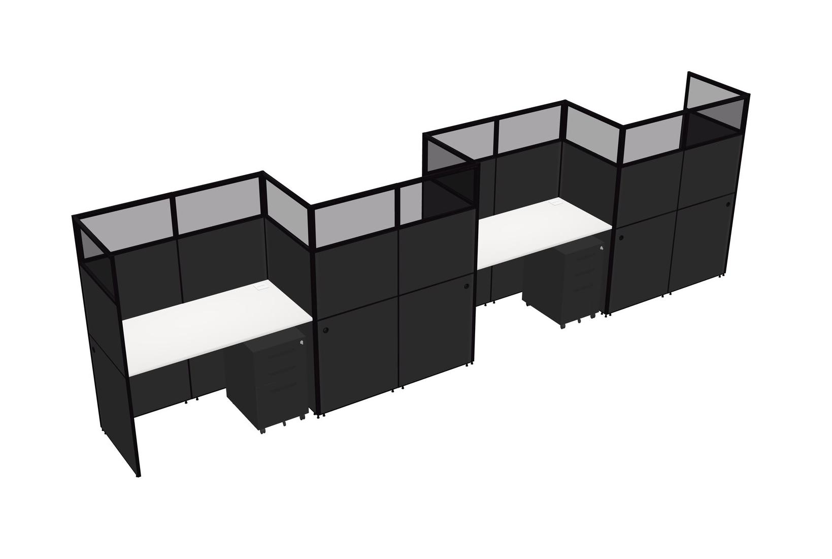 White Rectangular Cubicle Workstations For 4 - Zigzag Formation + Black Metal Mobile Drawers