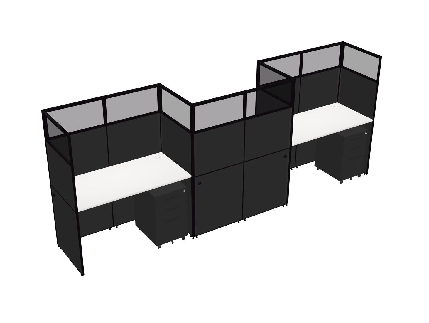 White Rectangular Cubicle Workstations For 3 - Zigzag Formation + Black Metal Mobile Drawers