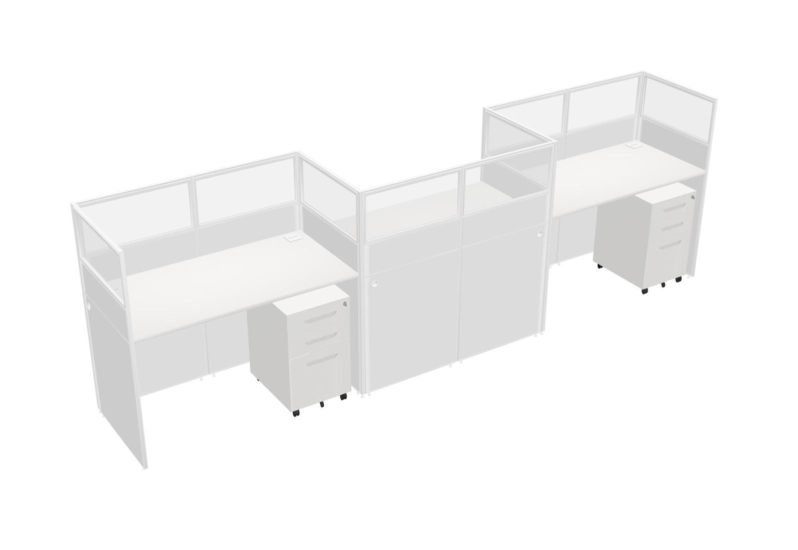 White Rectangular Cubicle Workstations For 3 - Zigzag Formation + White Metal Mobile Drawers