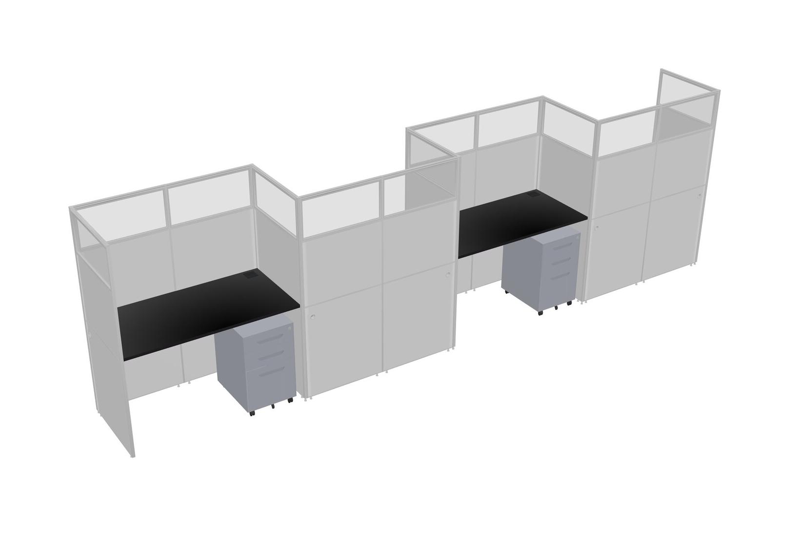 Black Rectangular Cubicle Workstations For 4 - Zigzag Formation + Grey Metal Mobile Drawers