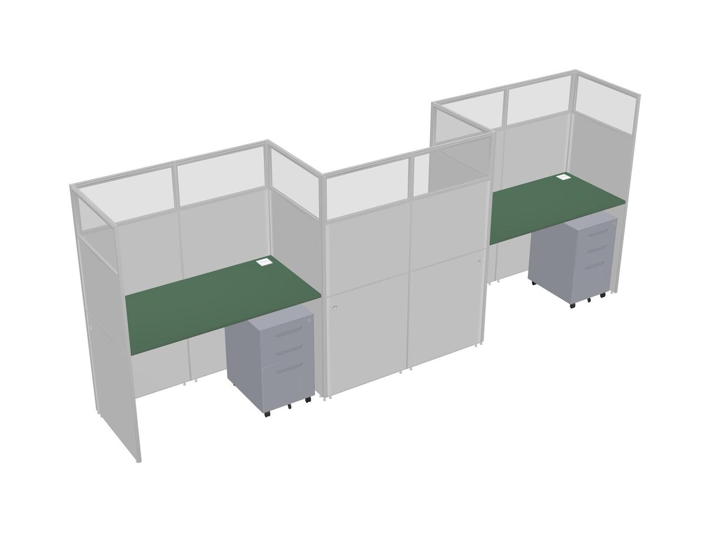 Green Rectangular Cubicle Workstations For 3 - Zigzag Formation + Grey Metal Mobile Drawers