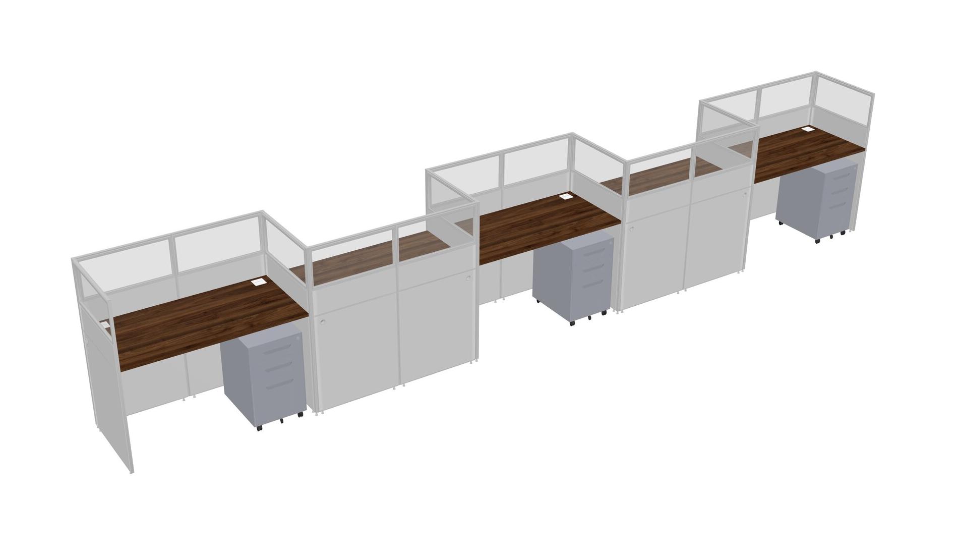 Columbia Walnut Rectangular Cubicle Workstations For 5 - Zigzag Formation + Grey Metal Mobile Drawers