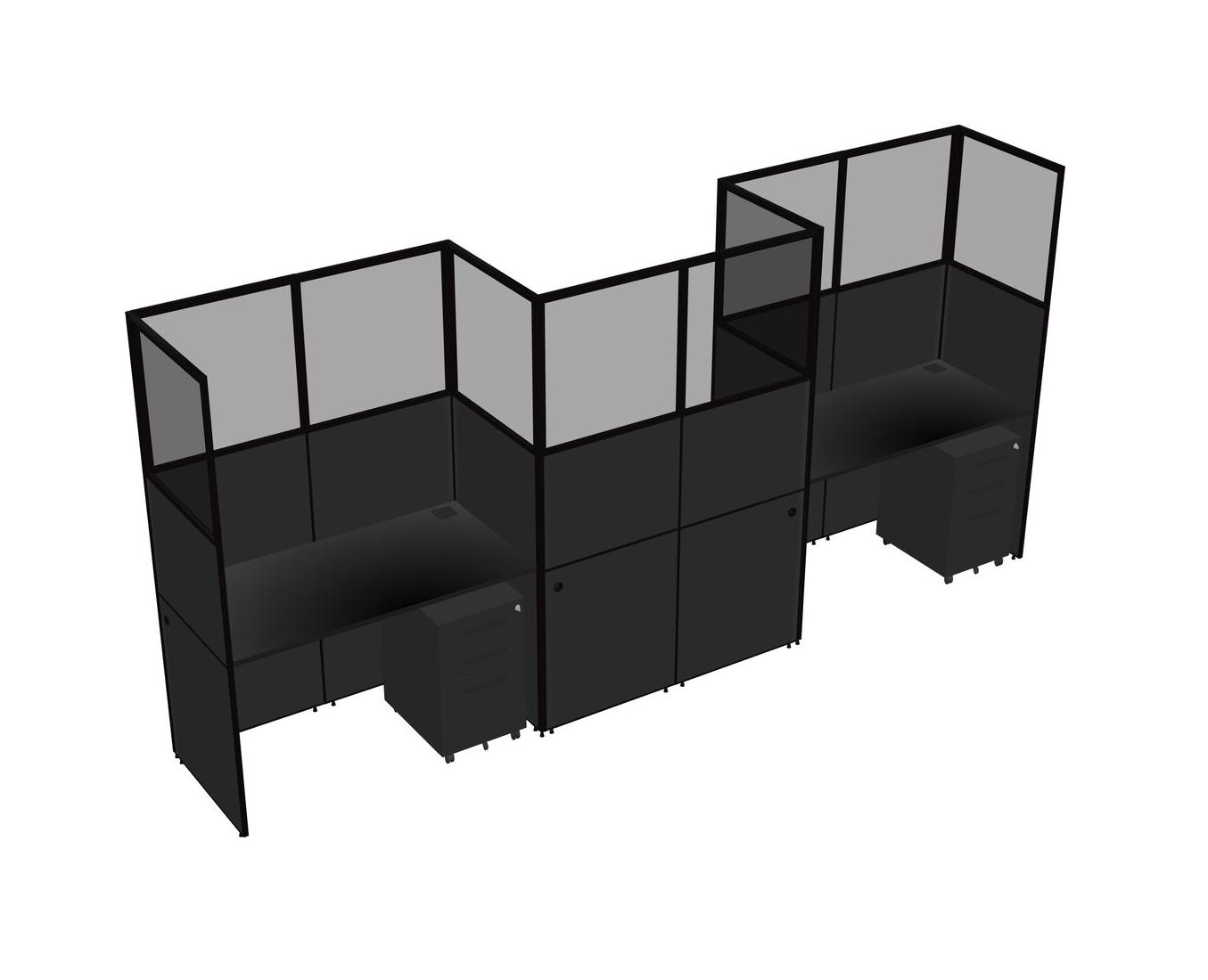 Black Rectangular Cubicle Workstations For 3 - Zigzag Formation + Black Metal Mobile Drawers