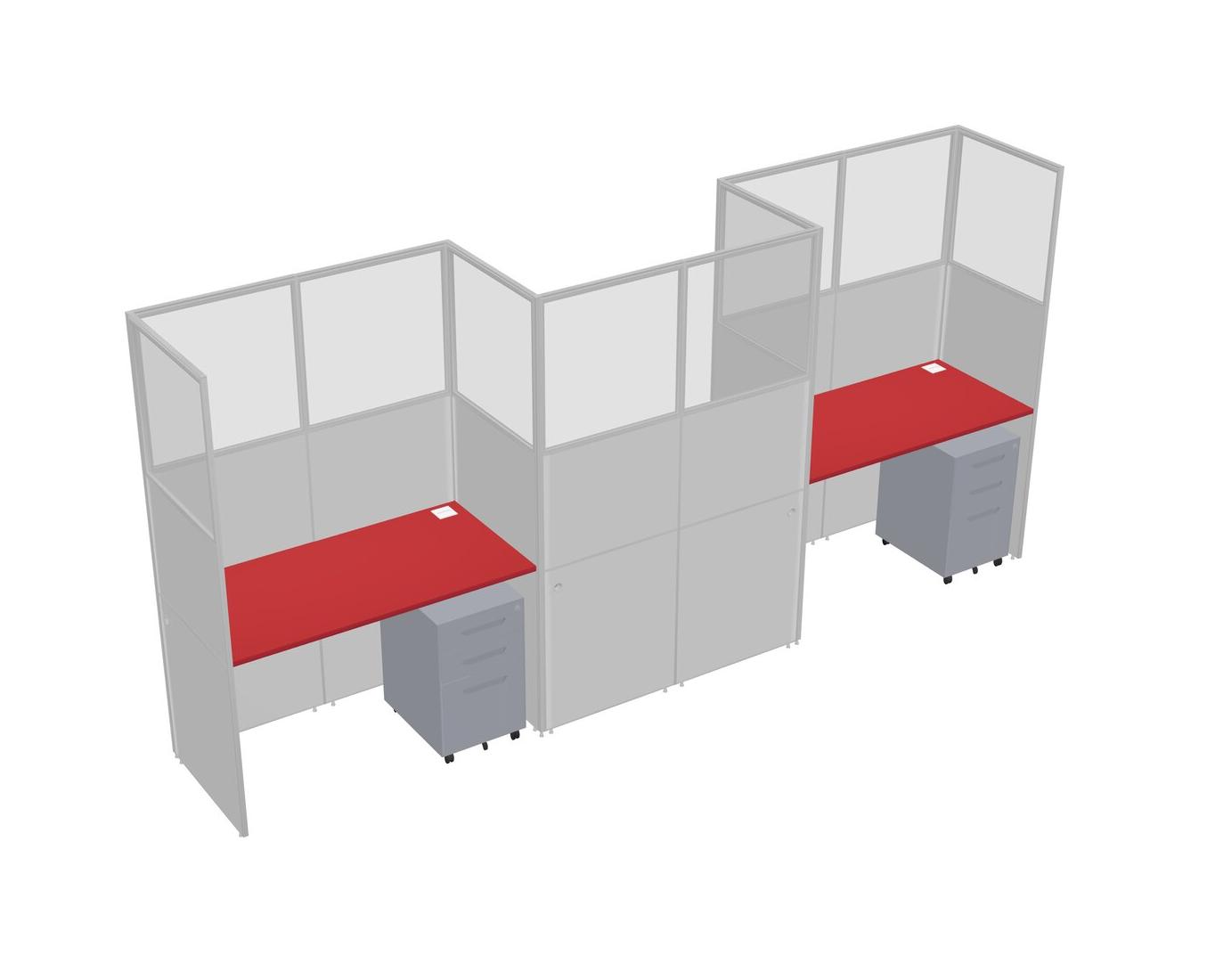 Prism Red Rectangular Cubicle Workstations For 3 - Zigzag Formation + Grey Metal Mobile Drawers