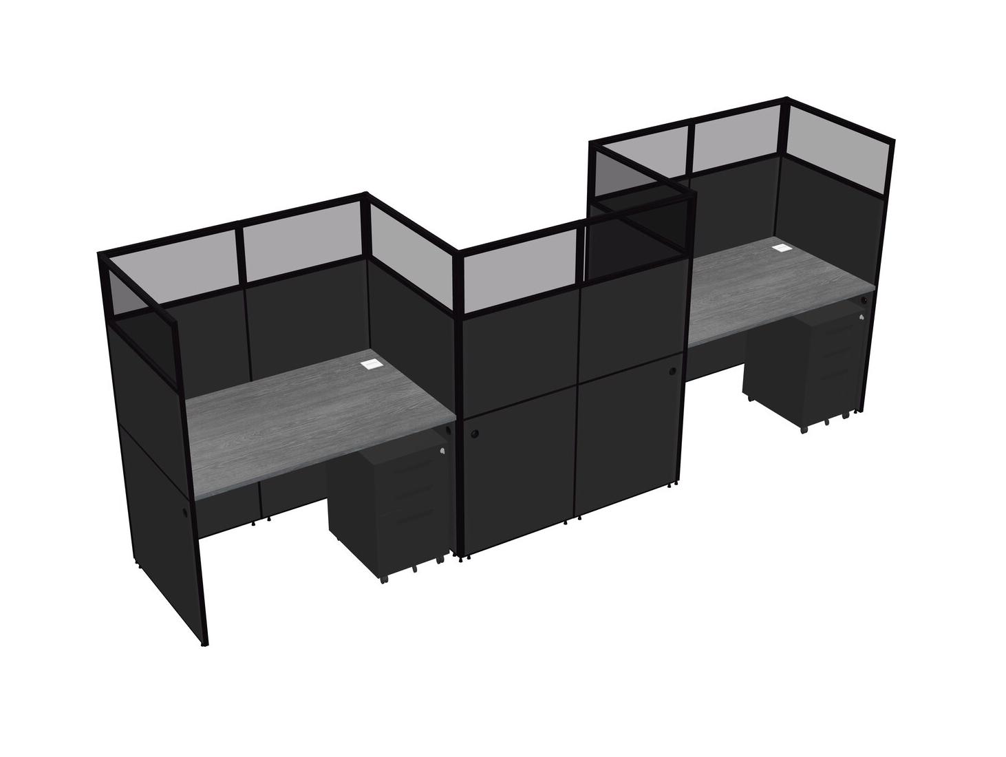 Grey Rectangular Cubicle Workstations For 3 - Zigzag Formation + Black Metal Mobile Drawers