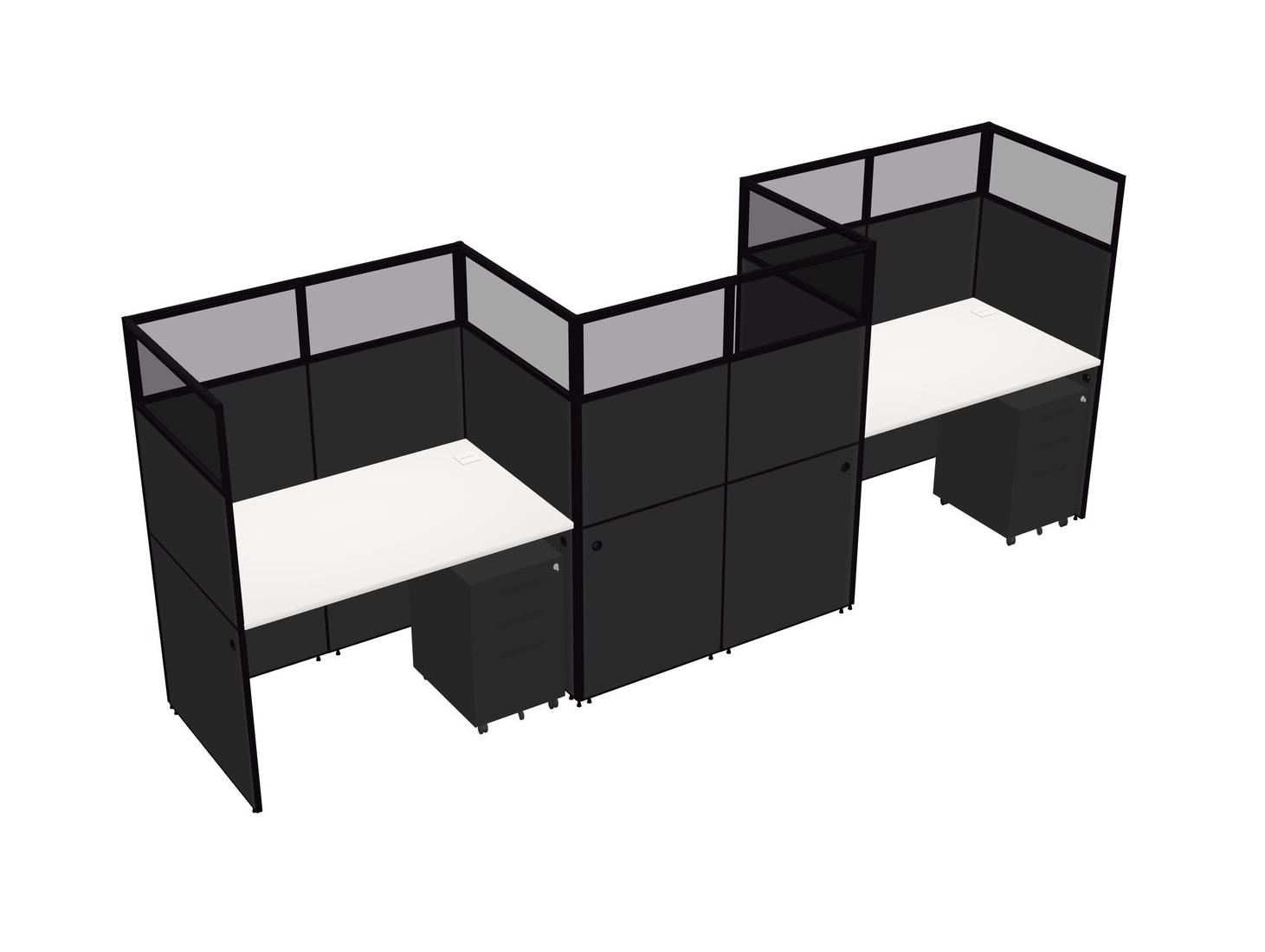 White Rectangular Cubicle Workstations For 3 - Zigzag Formation + Black Metal Mobile Drawers