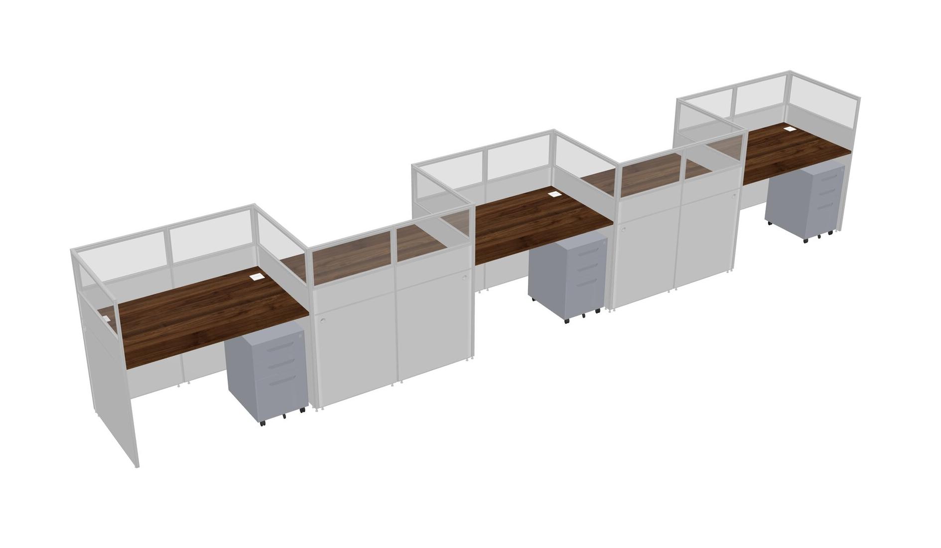 Columbia Walnut Rectangular Cubicle Workstations For 5 - Zigzag Formation + Grey Metal Mobile Drawers