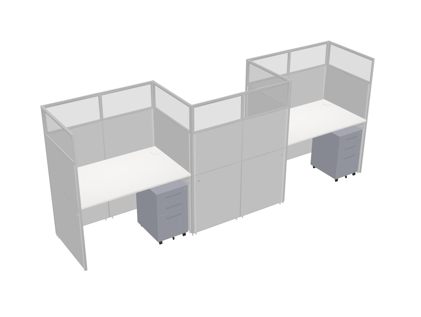 White Rectangular Cubicle Workstations For 3 - Zigzag Formation + Grey Metal Mobile Drawers