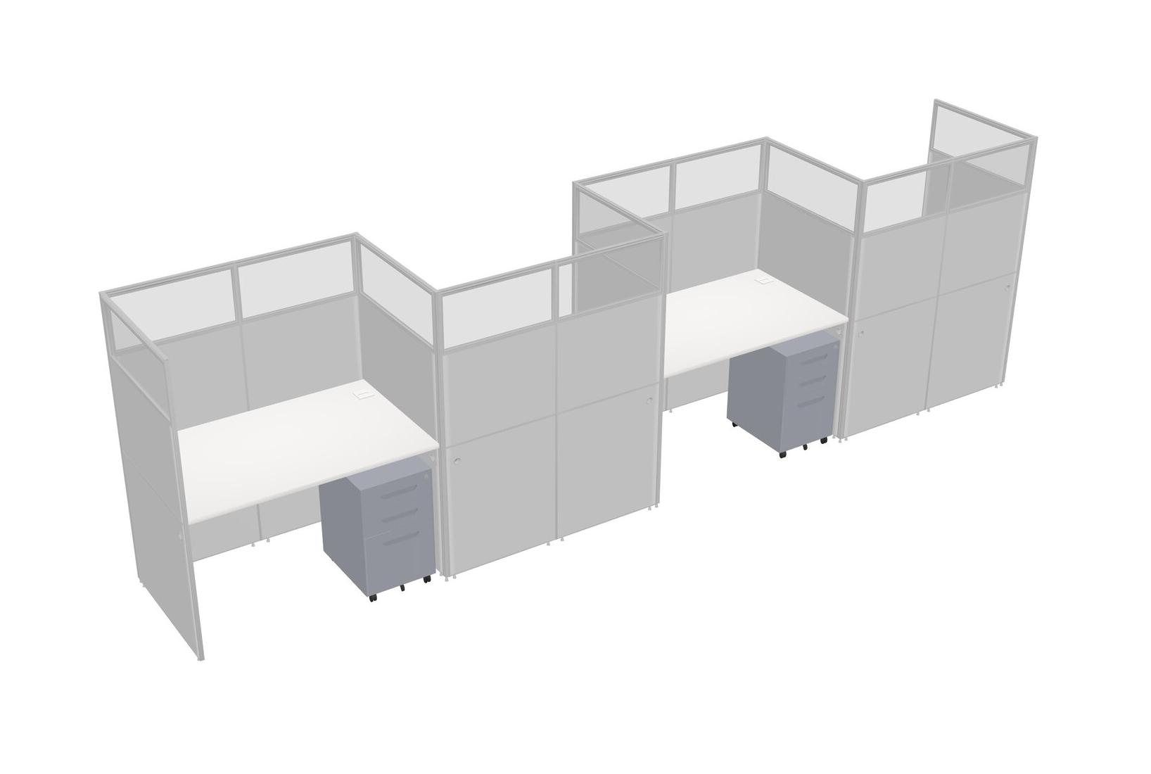 White Rectangular Cubicle Workstations For 4 - Zigzag Formation + Grey Metal Mobile Drawers