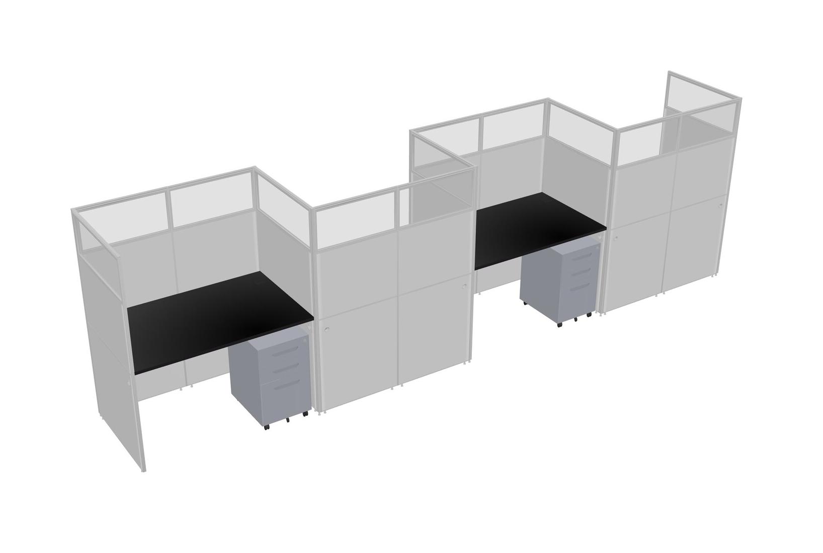 Black Rectangular Cubicle Workstations For 4 - Zigzag Formation + Grey Metal Mobile Drawers