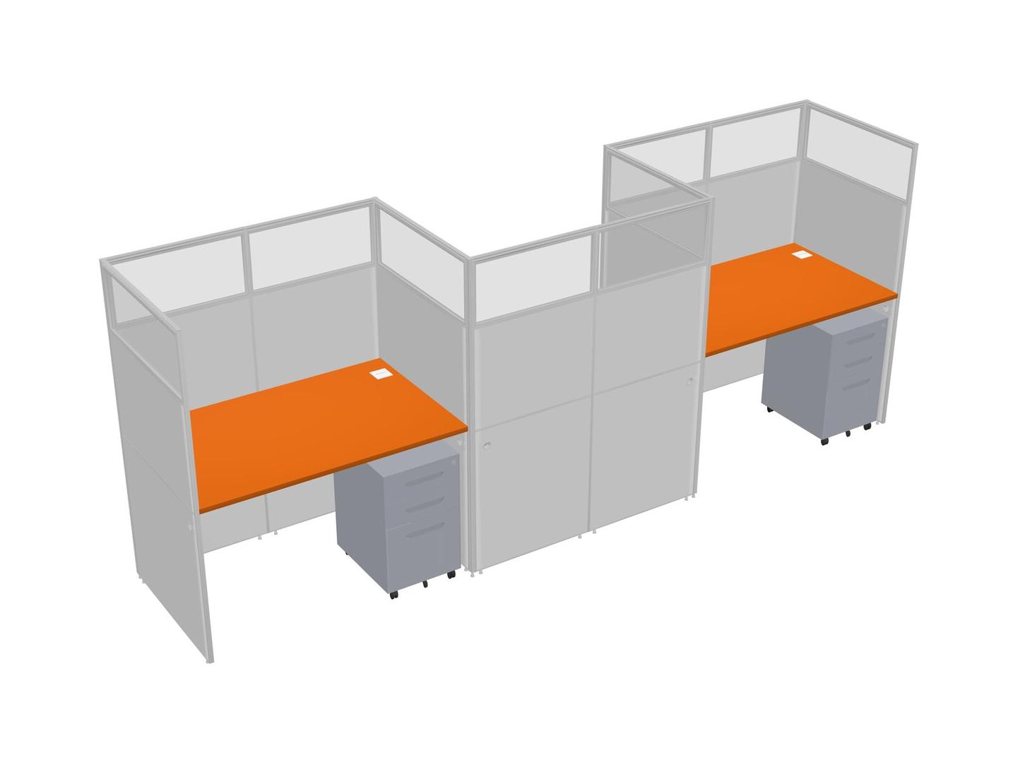 Orange Rectangular Cubicle Workstations For 3 - Zigzag Formation + Grey Metal Mobile Drawers