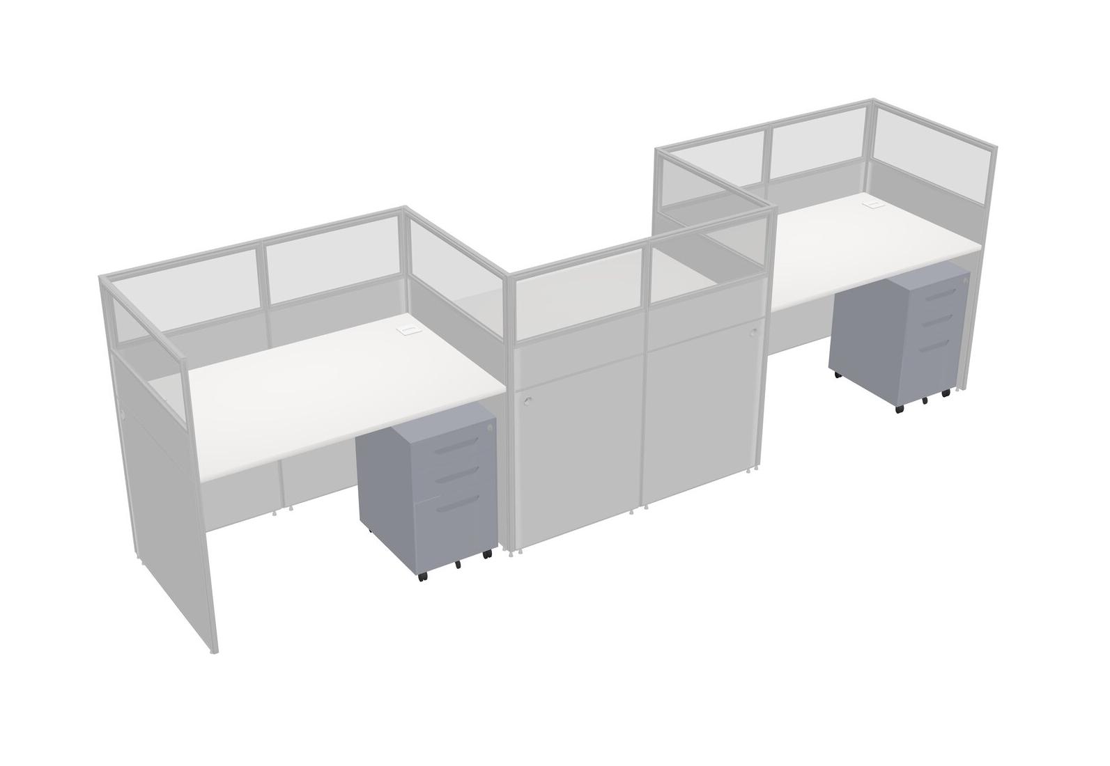 White Rectangular Cubicle Workstations For 3 - Zigzag Formation + Grey Metal Mobile Drawers