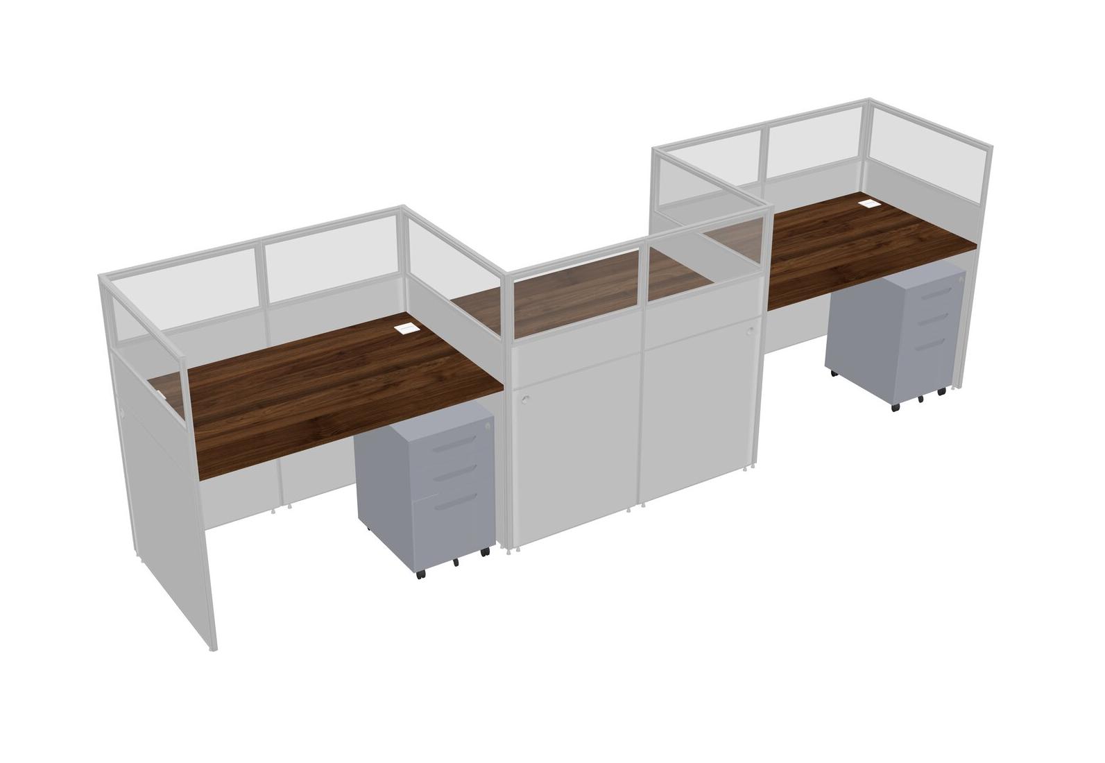 Columbia Walnut Rectangular Cubicle Workstations For 3 - Zigzag Formation + Grey Metal Mobile Drawers