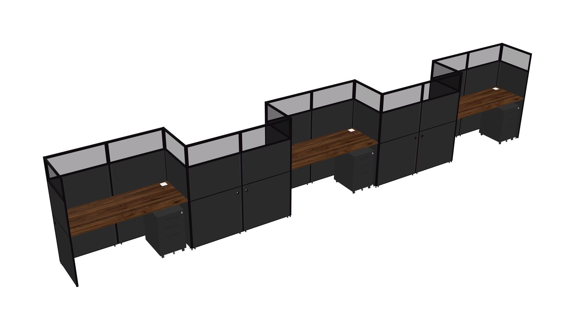 Columbia Walnut Rectangular Cubicle Workstations For 5 - Zigzag Formation + Black Metal Mobile Drawers