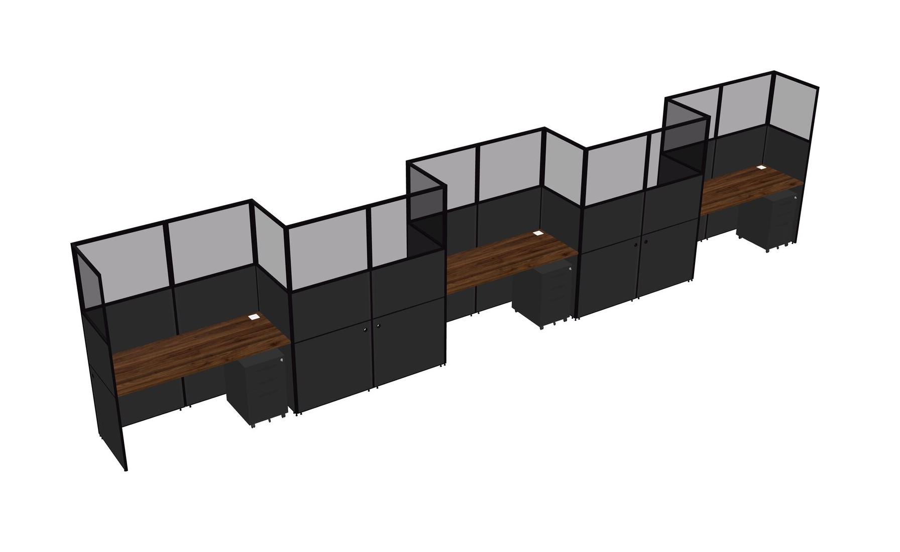 Columbia Walnut Rectangular Cubicle Workstations For 5 - Zigzag Formation + Black Metal Mobile Drawers