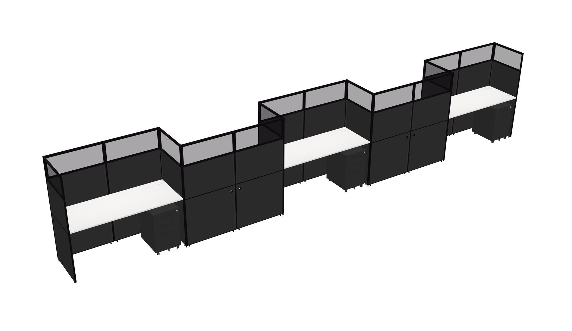 White Rectangular Cubicle Workstations For 5 - Zigzag Formation + Black Metal Mobile Drawers
