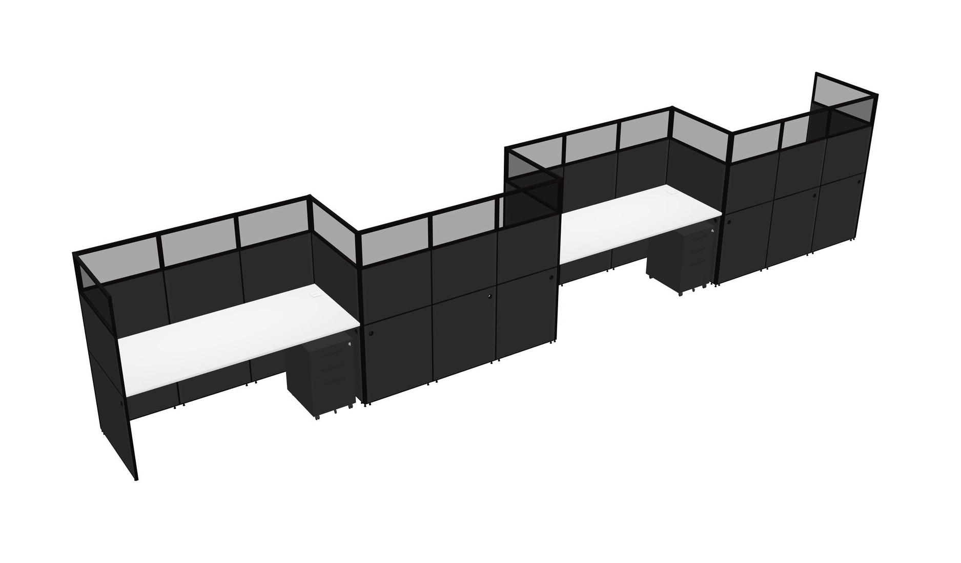 White Rectangular Cubicle Workstations For 4 - Zigzag Formation + Black Metal Mobile Drawers