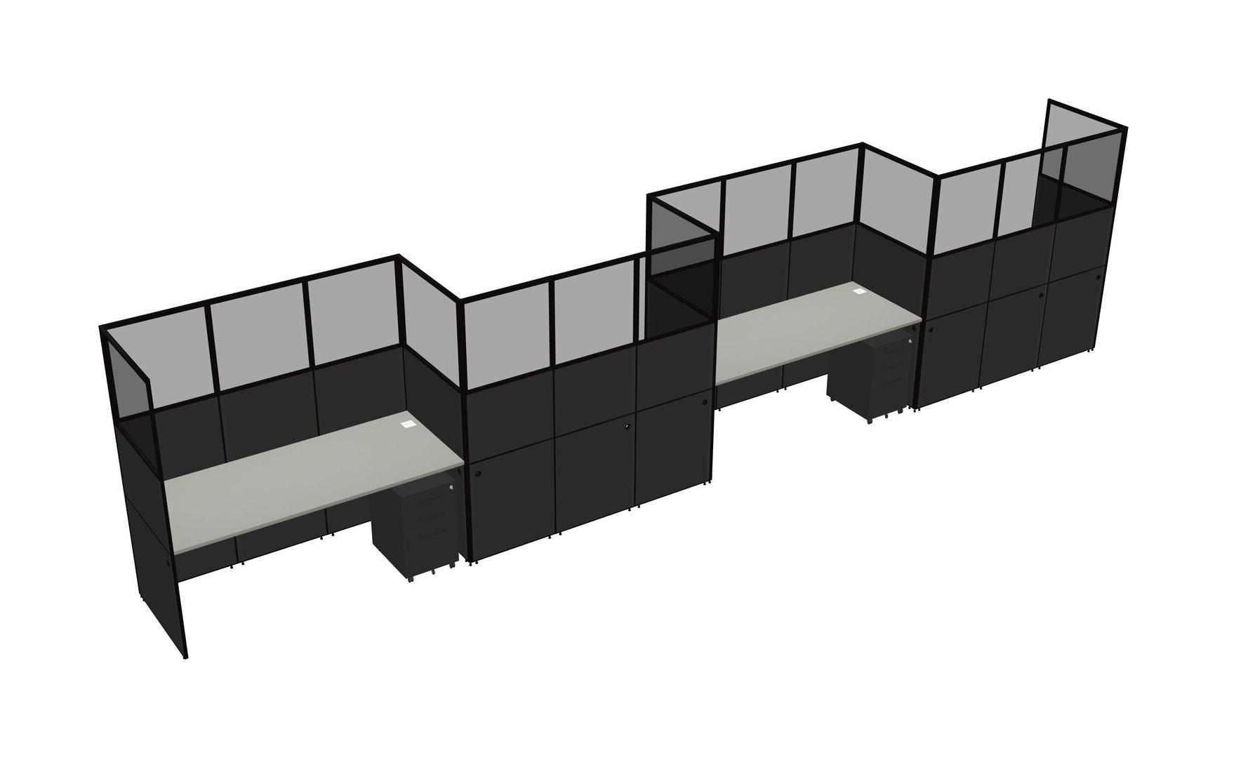 Grey Shadows Rectangular Cubicle Workstations For 4 - Zigzag Formation + Black Metal Mobile Drawers