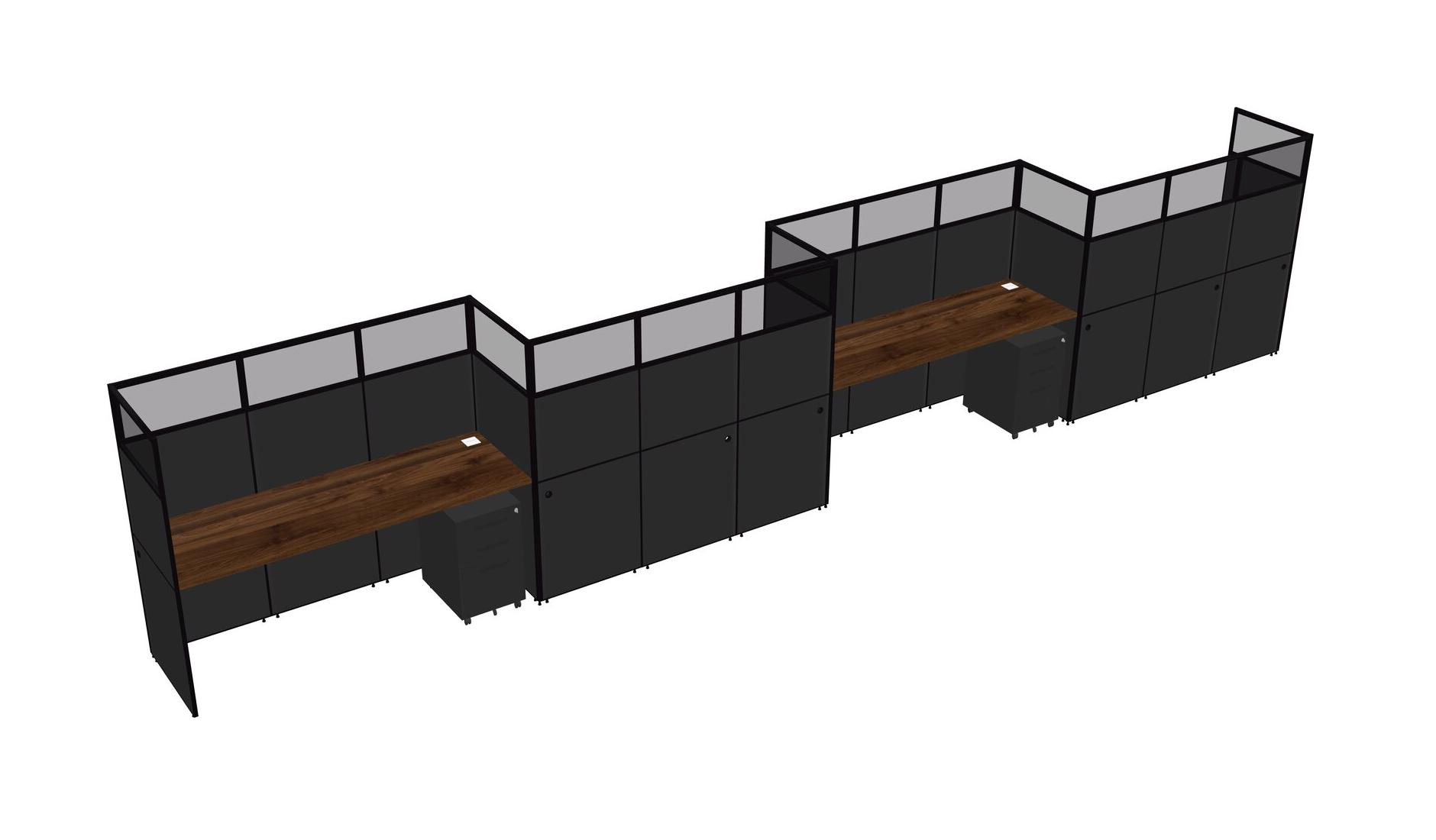 Columbia Walnut Rectangular Cubicle Workstations For 4 - Zigzag Formation + Black Metal Mobile Drawers