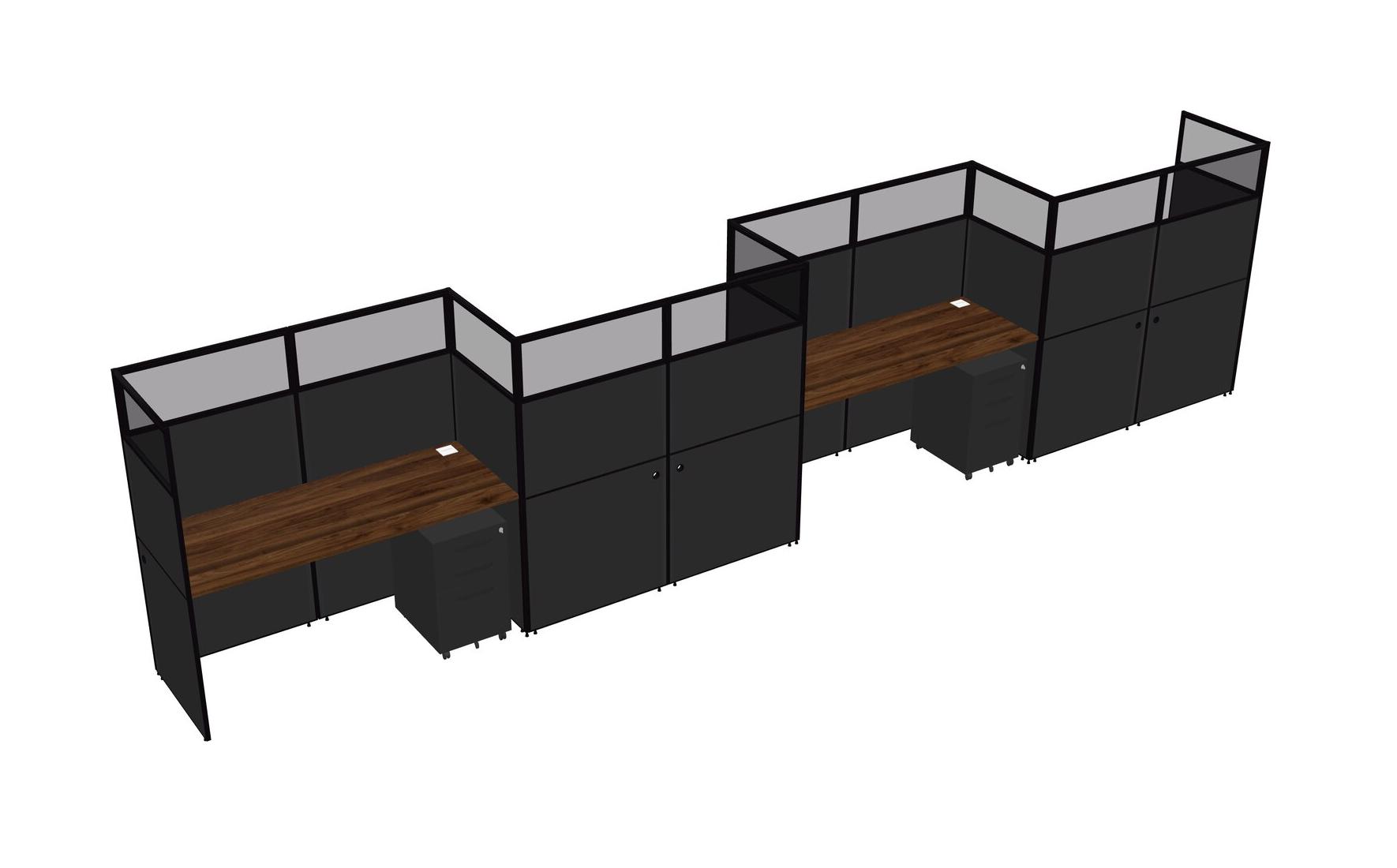 Columbia Walnut Rectangular Cubicle Workstations For 4 - Zigzag Formation + Black Metal Mobile Drawers