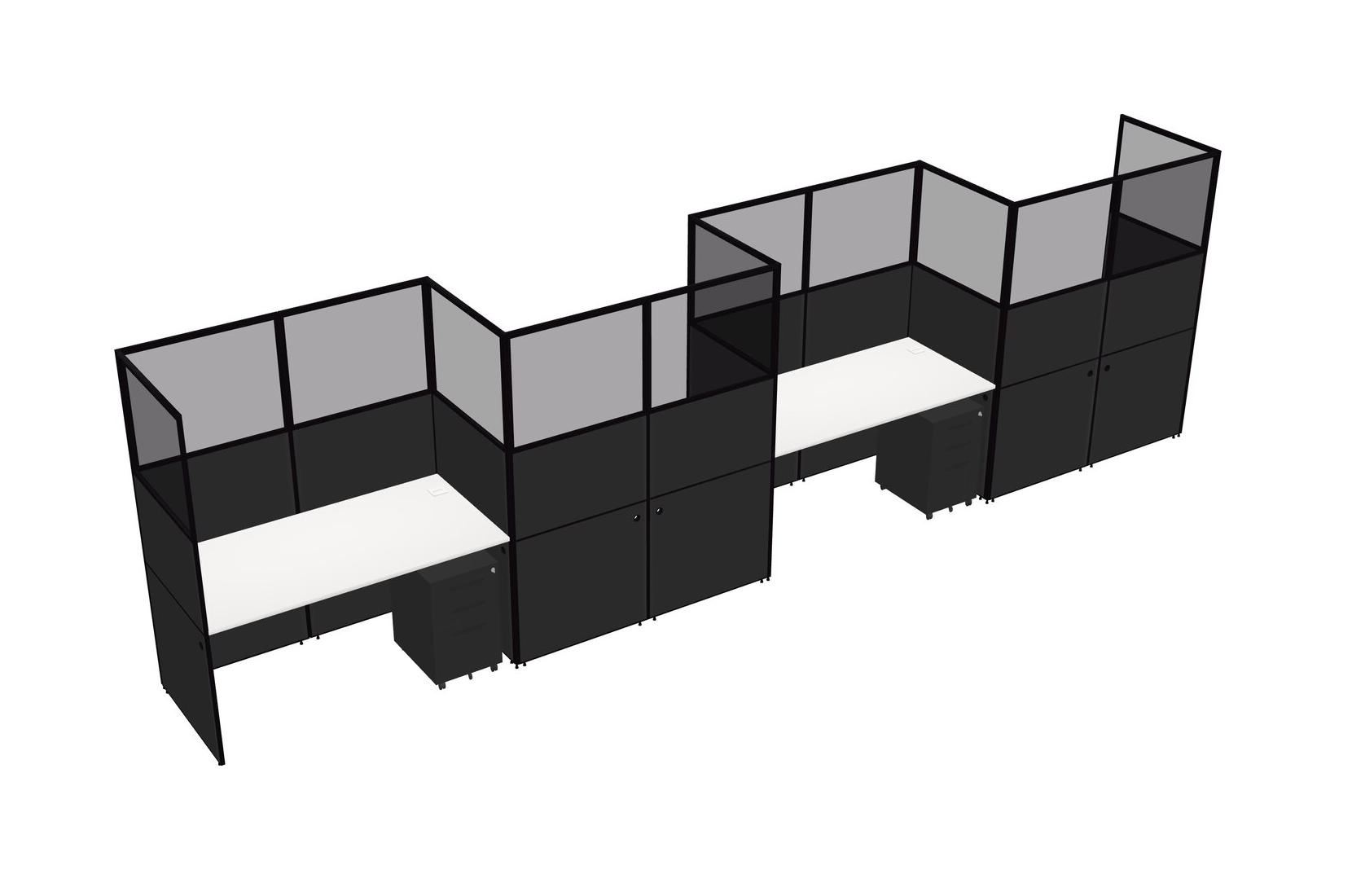 White Rectangular Cubicle Workstations For 4 - Zigzag Formation + Black Metal Mobile Drawers